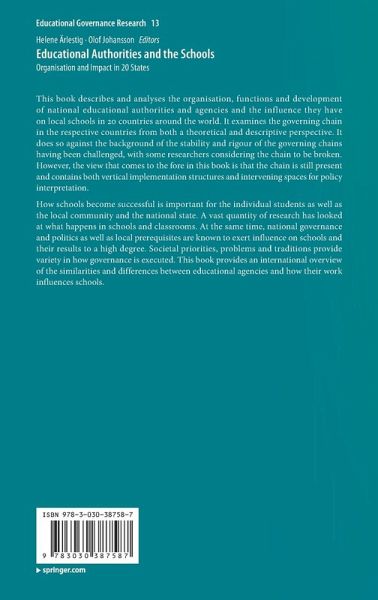 How schools become successful is important for the individual students as well as the local community and the national state. A vast quantity of research has looked at what happens in schools and classrooms. At the same time, national governance and politics as well as local prerequisites are known to exert influence on schools and their results to a high degree. Societal priorities, problems and traditions provide variety in how governance is executed. This book provides an international overview of the similarities and differences between educational agencies and how their work influences schools.
