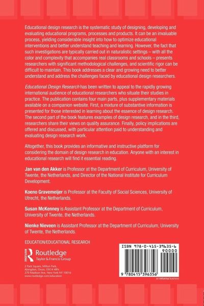 Part 1: What and Why Introducing Educational Design Research. Toward Productive Design Studies Part 2: Examples from the Field Design research from the Learning Design Perspective. Design Research from the Technology Perspective. Design Research from a Curriculum Perspective Part 3: Quality Assessing the Quality of Design Research Proposals: Some Philosophical Perspectives. Balancing Innovation and Risk: Assessing Design Research Proposals. Quality Criteria for Design Research: Evidence and Commitments Part 4: Moving Ahead From Design Research to Large-Scale Impact: Engineering Research in Education. Educational Design Research: The Value of Variety