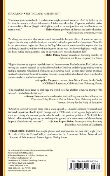 This insightful book dares to challenge the world we offer children when we trumpet 'No excuses!'-and offers a better way. -- Susan Ohanian, author; education activist; longtime teacher; fellow at the Education Policy Research Unit at Arizona State University and at th High-stakes testing appeals to politicians and bean counters. Real educators, like Lucido, use varying and creative methods to reach different kinds of children, and they judge their success by multiple measures. Which kind of students does America need-cookie cutter clones or critical thinkers? Educational Genocide describes the crisis in our public schools and offers remedies for parents, teachers, and administrators. -- Angelica Carpenter, curator, Arne Nixon Center for the Study of Children's Literature, California State University, Fresno As a long time educator who has witnessed first hand the harmful effects of test score hysteria, I appreciate the very readable in-depth research Lucido has provided in Educational Genocide. As our government begins the 'Race to the Top,' this book is a must-read for anyone who has children, is a teacher, or is involved in education in any way. I wish every legislator would read this book before casting another vote on any test score related education bill! -- Helen Pitton, literacy consultant; founding member of Educators and Parents Against Test Abuse This is not just a smart book. It is also a touchingly personal narrative. Don't be fooled by the fact that this work is vital and informative. It is far more than that. It's genius, and what makes it memorable is Lucido's gift to speak to us, not just from the head but from the heart as well. -- Elaine Garan, professor of literacy and early education, California State University, Fresno Education Genocide is much more than a wake-up call ... Lucido's exhaustive research and first-hand experience should ignite outrage and a '60s era revolt against high stakes test abuse overtaking the nation's public schools under the punitive politics of No Child Left Behind. Mind-numbing testing can no longer be ignored as a major source of escalating drop-out of students and teachers. -- Jo Ann Rupert Behm, former president, Learning Disabilities Association of California Lucido (Assessment Reform Network) challenges the notion of standardized testing in schools, warning of the danger of basing educational accountability on superficial test scores. Using research-based evidence, as well as firsthand experience in the form of personal narratives that are easily accessible to his readers, he strongly criticizes the industrial model of schooling and cautions that the educational system is being pushed in the wrong direction as it stifles students' creativity and imagination by focusing on test preparation. Lucido's voice and passion shine through in the numerous examples he uses to illustrate the narrowing of curriculum and the way teaching has been redefined by the extreme concentration on high-stakes testing. Lucido reminds readers that education should be a forgiving process of pushing students to think and achieve; he explains that teaching should be analogous to coaching. His comprehensive knowledge of the literature on testing, as well as extensive experience working with students, is evident, and his presentation of alternative approaches to assessing students' learning makes this book a must read for teachers, administrators, teacher-educators, and even parents. Summing Up: Highly recommended. Graduate, research, and professional collections. CHOICE