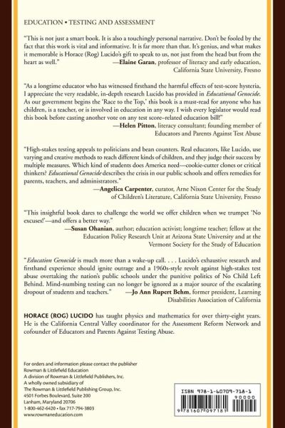 This insightful book dares to challenge the world we offer children when we trumpet 'No excuses!'-and offers a better way. -- Susan Ohanian, author; education activist; longtime teacher; fellow at the Education Policy Research Unit at Arizona State University and at th High-stakes testing appeals to politicians and bean counters. Real educators, like Lucido, use varying and creative methods to reach different kinds of children, and they judge their success by multiple measures. Which kind of students does America need-cookie cutter clones or critical thinkers? Educational Genocide describes the crisis in our public schools and offers remedies for parents, teachers, and administrators. -- Angelica Carpenter, curator, Arne Nixon Center for the Study of Children's Literature, California State University, Fresno As a long time educator who has witnessed first hand the harmful effects of test score hysteria, I appreciate the very readable in-depth research Lucido has provided in Educational Genocide. As our government begins the 'Race to the Top,' this book is a must-read for anyone who has children, is a teacher, or is involved in education in any way. I wish every legislator would read this book before casting another vote on any test score related education bill! -- Helen Pitton, literacy consultant; founding member of Educators and Parents Against Test Abuse This is not just a smart book. It is also a touchingly personal narrative. Don't be fooled by the fact that this work is vital and informative. It is far more than that. It's genius, and what makes it memorable is Lucido's gift to speak to us, not just from the head but from the heart as well. -- Elaine Garan, professor of literacy and early education, California State University, Fresno Education Genocide is much more than a wake-up call ... Lucido's exhaustive research and first-hand experience should ignite outrage and a '60s era revolt against high stakes test abuse overtaking the nation's public schools under the punitive politics of No Child Left Behind. Mind-numbing testing can no longer be ignored as a major source of escalating drop-out of students and teachers. -- Jo Ann Rupert Behm, former president, Learning Disabilities Association of California Lucido (Assessment Reform Network) challenges the notion of standardized testing in schools, warning of the danger of basing educational accountability on superficial test scores. Using research-based evidence, as well as firsthand experience in the form of personal narratives that are easily accessible to his readers, he strongly criticizes the industrial model of schooling and cautions that the educational system is being pushed in the wrong direction as it stifles students' creativity and imagination by focusing on test preparation. Lucido's voice and passion shine through in the numerous examples he uses to illustrate the narrowing of curriculum and the way teaching has been redefined by the extreme concentration on high-stakes testing. Lucido reminds readers that education should be a forgiving process of pushing students to think and achieve; he explains that teaching should be analogous to coaching. His comprehensive knowledge of the literature on testing, as well as extensive experience working with students, is evident, and his presentation of alternative approaches to assessing students' learning makes this book a must read for teachers, administrators, teacher-educators, and even parents. Summing Up: Highly recommended. Graduate, research, and professional collections. CHOICE