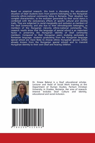 Based on empirical research, this book is discussing the educational situation of Deaf students born from parents belonging to the Hungarian minority ethnic-national community living in Romania. Their situation has complex characteristics, as the exclusion generated by their social status is combined with the exclusionary effects of specific cultural and identity traits. They are subjected to social marginality and exclusion as members of the Deaf community, and also due to their ethnolinguistic belonging, as members of the Hungarian minority ethnic-national community. The research results show that the language of special school is an important factor in preserving the Hungarian identity of Deaf community members. Compared to their Hungarian peers studying exclusively in Romanian language, students graduating from the Hungarian language special school are more likely to choose ethnic Hungarian spouses (often already known from the Hungarian special school) and to transmit Hungarian identity to their own Deaf and hearing children.