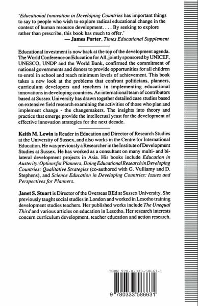 'Because of the insights offered the book under review should be compulsory reading for Ministers of Education and educational planners as well as for students of educational reform. They would find it readable, informative and disturbing. This could well become a classic account of why innovations fail. - Keith Watson, Department of Education Studies and Management, University of Reading Educational investment is now back at the top of the development agenda. The World Conference on Education for All confirmed the commitment of national governments and donors to provide opportunities for all children to enrol in school and reach minimum levels of achievement. This book takes a new look at the problems that confront politicians, planners, curriculum developers and teachers in implementing educational innovations in developing countries. The insights into theory and practice that emerge provide the intellectual yeast for the development of effective innovation strategies for the next decade.