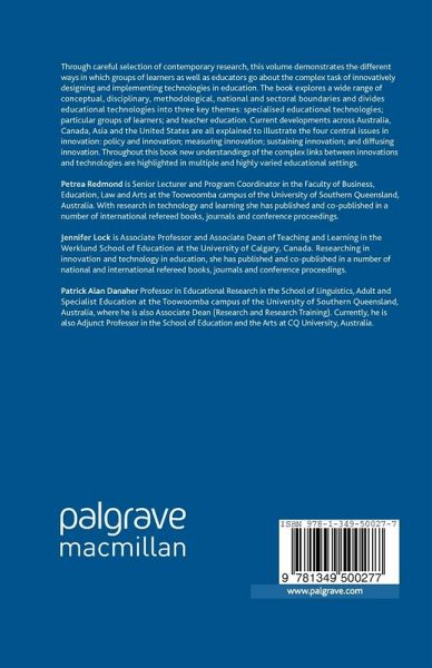 Foreword; Norm Vaughan 1. Interrogating Contemporary Research In Educational Innovation; Petrea Redmond, Jennifer Lock And Patrick Alan Danaher PART I: EDUCATIONAL INNOVATIONS AND SPECIALISED CONTEMPORARY TECHNOLOGIES Section One Introduction: Educational Innovations And Specialised Contemporary Technologies; Petrea Redmond 2. Technology Navigators: An Innovative Role In Pedagogy, Design And Instructional Support; William Cain 3. Wearable Devices In Education; Sandra Sawaya PART II: EDUCATIONAL INNOVATIONS AND TECHNOLOGIES AND PARTICULAR GROUPS OF LEARNERS Section Two Introduction: Educational Innovations And Technologies And Particular Groups Of Learners; Jennifer Lock 4. Discussion Of Innovative Ideas To Address Mathematics Anxiety And Technology Issues For Students Transitioning To High School; Nicholas Flegg 5. Digital Innovations To Increase Participation In Internet Restricted Prison Learning Environments; Angela Murphy 6. English Bilingual Education In An Indonesian Public School; Sri Wuli Fitriati PART III: EDUCATIONAL INNOVATIONS AND TECHNOLOGIES AND TEACHER EDUCATION Section Three Introduction: Educational Innovations And Technologies And Teacher Education; Patrick Alan Danaher 7. A Pedagogical Continuum: The Journey From Face-To-Face To Online Teaching; Petrea Redmond 8. Investigating Pre-Service Teachers' Inquiry Into Indigenous Perspectives; Petrea Redmond And Jennifer Lock 9. Working Together: An International Collaborative Learning Project For Pre-Service Teachers; Warren Midgley, Henriette Van Rensburg And Laurence Tamatea
