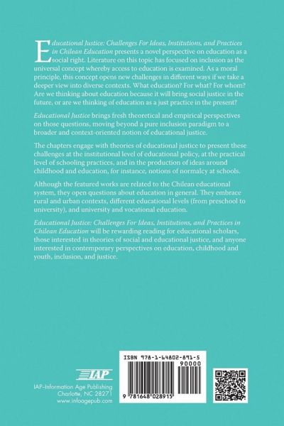 This book presents a novel perspective on education as a social right. Literature on this topic has focused on inclusion as the universal concept whereby access to education is examined. As a moral principle, this concept opens new challenges in different ways if we take a deeper view into diverse contexts. What education? For what? For whom? Are we thinking about education because it will bring social justice in the future, or are we thinking of education as a just practice in the present? This book brings fresh theoretical and empirical perspectives on those questions, moving beyond a pure inclusion paradigm to a broader and context-oriented notion of educational justice. The chapters engage with theories of educational justice to present these challenges at the institutional level of educational policy, at the practical level of schooling practices, and in the production of ideas around childhood and education, for instance, notions of normalcy at schools.Although the featured works are related to the Chilean educational system, they opens questions about education in general. They embrace rural and urban contexts, different educational levels (from preschool to university), and university and vocational education. This book will be rewarding reading for educational scholars, those interested in theories of social and educational justice, and anyone interested in contemporary perspectives on education, childhood and youth, inclusion, and justice.