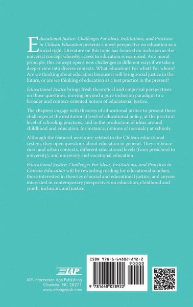 This book presents a novel perspective on education as a social right. Literature on this topic has focused on inclusion as the universal concept whereby access to education is examined. As a moral principle, this concept opens new challenges in different ways if we take a deeper view into diverse contexts. What education? For what? For whom? Are we thinking about education because it will bring social justice in the future, or are we thinking of education as a just practice in the present? This book brings fresh theoretical and empirical perspectives on those questions, moving beyond a pure inclusion paradigm to a broader and context-oriented notion of educational justice. The chapters engage with theories of educational justice to present these challenges at the institutional level of educational policy, at the practical level of schooling practices, and in the production of ideas around childhood and education, for instance, notions of normalcy at schools.Although the featured works are related to the Chilean educational system, they opens questions about education in general. They embrace rural and urban contexts, different educational levels (from preschool to university), and university and vocational education. This book will be rewarding reading for educational scholars, those interested in theories of social and educational justice, and anyone interested in contemporary perspectives on education, childhood and youth, inclusion, and justice.