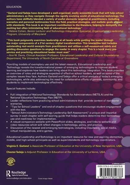 Providing models of exemplary use and the latest research, Educational Leadership and Technology reveals the transformational power of emerging technologies to improve student learning, and explores how leaders can bring about this technology integration. This book provides an overview of roles and strategies expected of effective school leaders, as well as some of the complex issues they face. Authors Garland and Tadeja offer a critical analysis of today's emerging technology, while also addressing the need for collaborative efforts of parents, community, and students to implement technologies effectively. Special Features Include: Full integration of National Technology Standards for Administrators (NETS.A) and the National Education Technology Plan (NETP). Leader reflections from practicing school administrators that provide context of real-world scenarios. "Tips for School Leaders" and end-of-chapter questions that encourage student engagement with the text. "School Administrator's Technology Leadership Self-Assessment," a unique and impartial survey in each chapter with self-scoring guide that helps readers determine their technology use and readiness for implementation. A robust companion website with PowerPoint Slides, strategies, and links to website and video resources which will reflect changes in technology, policy, and practice. Discussion of the newest and emerging technologies, including Cloudware, social media, virtual manipulatives, and e-games. Educational Leadership and Technology is an important resource for new and aspiring elementary, middle, and high school principals as well as superintendents and technology coordinators.