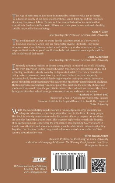 As our student population diversifies rapidly, there is a critical need to better understand how national, regional, and/or local policies impact youth in school settings. In many cases, educational policies constructed with the goal of helping youth often have the unintended consequence of inhibiting youth's potential. This is especially the case when it comes to youth from historically underrepresented groups. Over and over, educational legislation aimed at improving life for youth has had the negative effect of eroding opportunities for our most vulnerable and often times less visible youth. The authors of this book examine the schooling experiences of Hispanic, African American, Indigenous, poor, and LGBT youth groups as a way to spotlight the marginalizing and shortsighted effects of national education language, immigration, and school reform policies. Leading authors from across the country highlight how educational policies impact youth's development and socialization in school contexts. In most cases, policies are constructed by adults, implemented by adults, but are rarely informed by the needs and opinions of youth. Not only are youth not consulted but also policymakers often neglect what we know about the psychological, emotional, and educational health of youth. Therefore, both the short and long term impact of these policies have but limited effects on improving students' school performance or personal health issues such as depression or suicide. In highlighting the demographic and cultural shifts of the 21st century, this book provides a compelling case for policymakers and their constituents to become more sensitive to the diverse needs of our changing student population and to advocate for policies that better serve them.