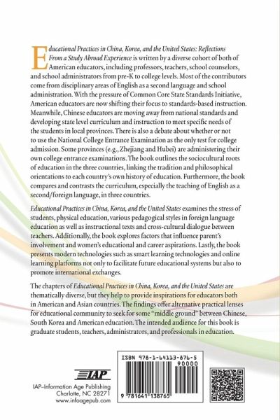 This book is written by a diverse cohort of both of American educators, including professors, teachers, school counselors, and school administrators from pre-K to college levels. Most of the contributors come from disciplinary areas of English as a second language and school administration. With the pressure of Common Core State Standards Initiative, American educators are now shifting their focus to standards-based instruction. Meanwhile, Chinese educators are moving away from national standards and developing state level curriculum and instruction to meet specific needs of the students in local provinces. There is also a debate about whether or not to use the National College Entrance Examination as the only test for college admission. Some provinces (e.g., Zhejiang and Hubei) are administering their own college entrance examinations. The book outlines the sociocultural roots of education in the three countries, linking the tradition and philosophical orientations to each country's own history of education. Furthermore, the book compares and contrasts the curriculum, especially the teaching of English as a second/foreign language, in three countries. This book examines the stress of students, physical education, various pedagogical styles in foreign language education as well as instructional texts and cross-cultural dialogue between teachers. Additionally, the book explores factors that influence parent's involvement and women's educational and career aspirations. Lastly, the book presents modern technologies such as smart learning technologies and online learning platforms not only to facilitate future educational systems but also to promote international exchanges. The chapters of the book are thematically diverse, but they help to provide inspirations for educators both in American and Asian countries. The findings offer alternative practical lenses for educational community to seek for some "middle ground" between Chinese, South Korea and American education. The intended audience for this book is graduate students, teachers, administrators, and professionals in education.