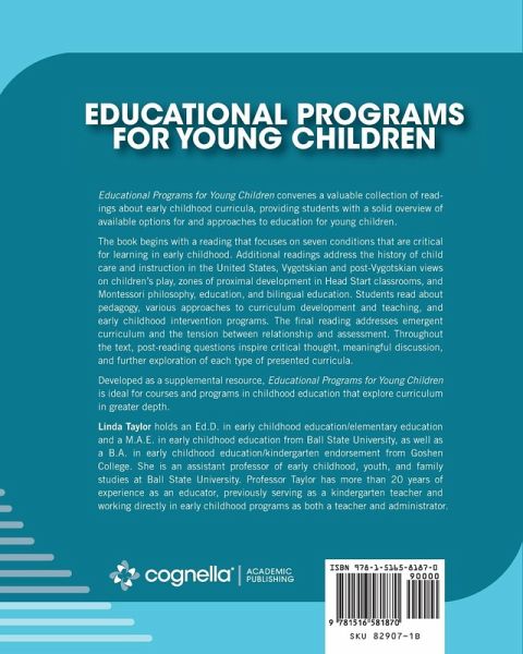 Educational Programs for Young Children convenes a valuable collection of readings about early childhood curricula, providing students with a solid overview of available options for and approaches to education for young children. The book begins with a reading that focuses on seven conditions that are critical for learning in early childhood. Additional readings address the history of child care and instruction in the United States, Vygotskian and post-Vygotskian views on children's play, zones of proximal development in Head Start classrooms, and Montessori philosophy, education, and bilingual education. Students read about pedagogy, various approaches to curriculum development and teaching, and early childhood intervention programs. The final reading addresses emergent curriculum and the tension between relationship and assessment. Throughout the text, post-reading questions inspire critical thought, meaningful discussion, and further exploration of each type of presented curricula. Developed as a supplemental resource, Educational Programs for Young Children is ideal for courses and programs in childhood education that explore curriculum in greater depth. Linda Taylor holds an Ed.D. in early childhood education/elementary education and a M.A.E. in early childhood education from Ball State University, as well as a B.A. in early childhood education/kindergarten endorsement from Goshen College. She is an assistant professor of early childhood, youth, and family studies at Ball State University. Professor Taylor has more than 20 years of experience as an educator, previously serving as a kindergarten teacher and working directly in early childhood programs as both a teacher and administrator.