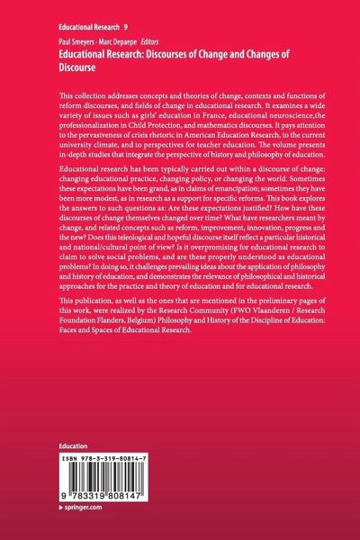 Educational research has been typically carried out within a discourse of change: changing educational practice, changing policy, or changing the world. Sometimes these expectations have been grand, as in claims of emancipation; sometimes they have been more modest, as in research as a support for specific reforms. This book explores the answers to such questions as: Are these expectations justified? How have these discourses of change themselves changed over time? What have researchers meant by change, and related concepts such as reform, improvement, innovation, progress and the new? Does this teleological and hopeful discourse itself reflect a particular historical and national/cultural point of view? Is it over promising for educational research to claim to solve social problems, and are these properly understood as educational problems? In doing so, it challenges prevailing ideas about the application of philosophy and history of education, and demonstrates the relevance of philosophical and historical approaches for the practice and theory of education and for educational research.