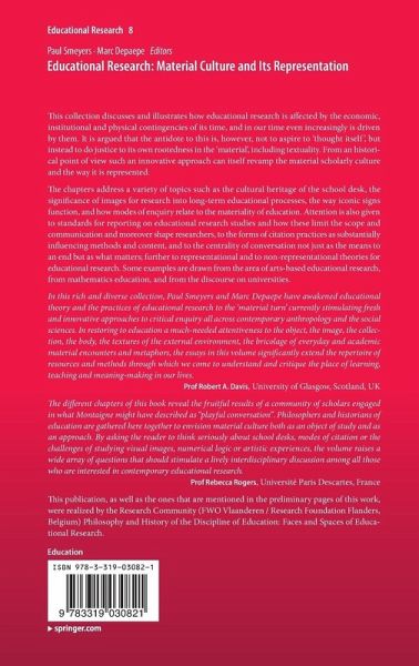 This collection discusses and illustrates how educational research is affected by the economic, institutional and physical contingencies of its time, and in our time even increasingly is driven by them. It is argued that the antidote to this is, however, not to aspire to 'thought itself', but instead to do justice to its own rootedness in the 'material', including textuality. From an historical point of view such an innovative approach can itself revamp the material scholarly culture and the way it is represented. The chapters address a variety of topics such as the cultural heritage of the school desk, the significance of images for research into long-term educational processes, the way iconic signs function, and how modes of enquiry relate to the materiality of education. Attention is also given to standards for reporting on educational research studies and how these limit the scope and communication and moreover shape researchers, to the forms of citation practices as substantially influencing methods and content, and to the centrality of conversation not just as the means to an end but as what matters; further to representational and to non-representational theories for educational research. Some examples are drawn from the area of arts-based educational research, from mathematics education, and from the discourse on universities.