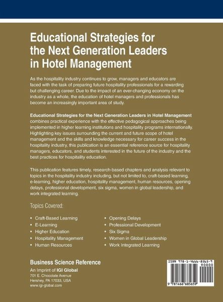As the hospitality industry continues to grow, managers and educators are faced with the task of preparing future hospitality professionals for a rewarding but challenging career. Due to the impact of an ever-changing economy on the industry as a whole, the education of hotel managers and professionals has become an increasingly important area of study. Educational Strategies for the Next Generation Leaders in Hotel Management combines practical experience with the effective pedagogical approaches being implemented in higher learning institutions and hospitality programs internationally. Highlighting key issues surrounding the current and future scope of hotel management and the skills and knowledge necessary for career success in the hospitality industry, this publication is an essential reference source for hospitality managers, educators, and students interested in the future of the industry and the best practices for hospitality education. This publication features timely, research-based chapters and analysis relevant to topics in the hospitality industry including, but not limited to, craft-based learning, e-learning, higher education, hospitality management, human resources, opening delays, professional development, six sigma, women in global leadership, and work integrated learning.