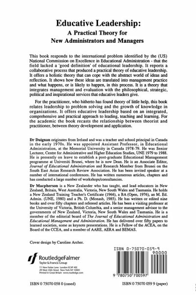Responding to the international problem identified by the US National Commission on Excellence in Educational Administration, that the field of educational leadership lacks a "good definition", this book reports a collaboration process that produced a practical theory of educative leadership. In offering a holistic theory which deals with the abstract world of ideas and reflection, this volume shows how these ideas are translated into management practice and what happens, or what is likely to happen in such a process. The theory integrates management and evaluation with the philosophical, strategic, political and inspirational services that educative leaders give. It is aimed at lecturers in education administration/management, headteachers, MEd lecturers and students, leadership and management lecturers and students.
