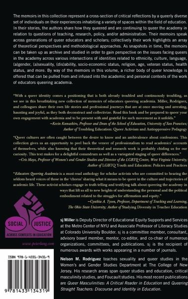 Jen Gilbert: Foreword - Acknowledgments - sj Miller and Nelson M. Rodriguez: Introduction: The Critical Praxis of Queer Memoirs in Education - Part 1: Queer Paranoia: To Risk or Not to Risk - Adam J. Greteman: Contingent Labor, Contingently Queer - Summer Pennell: Queer Paranoia: Worrying About and Through a Queer Dissertation Study - Ryan Burns and Janet D. Johnson: Reconciling the Personal and Professional: Coming Out From the Classroom Closet - Part 2: Queered Tensions: Beyond the Academy - Sara Staley and Bethy Leonardi: Remaining Stubbornly Faithful: What Queering Academia Does to Queer Teacher-Scholars - Michael Borgstrom: Inside. Out. Queer Time in Midcareer - Kristen A. Renn: How I Met Foucault: An Intellectual Career in, Around, and Near Queer Theory - Part 3: Queering Academic Spaces: Renarrating Lives - Nelson M. Rodriguez: From Doctoral Student to Dr. Sweetie Darling: My Queer(ing) Journey in Academia - Jenny Kassen and Alicia Lapointe: Working With and Within: Weaving Queer Spaces With Cycles of Resistance - Stephanie Anne Shelton: Adopting a Queer Pedagogy as a Teaching Assistant - Michael Wenk: Sanctioning Unsanctioned Texts: The True Story of a Gay Writer - Part 4: Misrecognition: From Invisibility Into Visibility- sj Miller: (Un)becoming Trans*: Every Breath You Take and Every ... - Kerrita K. Mayfield: Queering the Inquiry Body: Critical Science Teaching From the Margins - Darrell Cleveland Hucks: Intersectional Warrior: Battling the Onslaught of Layered Microaggressions in the Academy - Erich N. Pitcher: Undone and (Mis)Recognized: Disorienting Experiences of a Queer, Trans* Educator - Part 5: The Political Is Personal - Catherine A. Lugg: Slam Dunk on Tenure? Not So Fast ... - Kamden K. Strunk, Douglas R. Bristol, and William C. Takewell: Queering South Mississippi: Simple and Seemingly Impossible Work - Scotty M. Secrist: Smear the Queer: A Critical Memoir - Thabo Msibi: "I heard it from a good source": Queer Desire and Homophobia in a South African Higher Education Institution - Part 6: Queered All the Way Through - David Lee Carlson: A Profound Moment of Passing - Dana M. Stachowiak: Being Queer in Academia Queering Academia - William F. Pinar: The Constant in My Life - Contributors