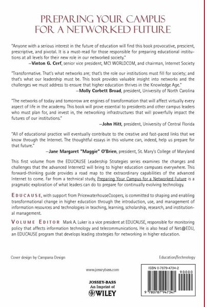 Sponsored by EDUCAUSE and PricewaterhouseCoopers LLP "Anyone with a serious interest in the future of education will find this book provocative, prescient, prescriptive, and pivotal. It is a must-read for those responsible for preparing educational institutions at all levels for their new role in our networked society." --Vinton G. Cerf, senior vice president, MCI WORLDCOM, and chairman, Internet Society "Transformative. That's what networks are; that's the role our institutions must fill for society; and that's what our leadership must be. This book provides valuable insight into networks and the challenges we must address to ensure that higher education thrives in the Knowledge Age." --Molly Corbett Broad, president, University of North Carolina "The networks of today and tomorrow are...engines of transformation that will affect virtually every aspect of life in the academy. This book will prove essential to presidents and other campus leaders who must plan for, and invest in, the networking infrastructures that will powerfully impact the futures of our institutions." --John Hitt, president, University of Central Florida "All of educational practice will eventually contribute to the creative and fast-paced links that we know through the Internet. The thoughtful essays in this volume can, indeed, help us prepare for that future." --Jane Margaret "Maggie" O'Brien, president, St. Mary's College of Maryland This first volume from the EDUCAUSE Leadership Strategies series examines the changes and challenges that the advanced Internet2 will bring to higher education campuses everywhere. This forward-thinking guide provides a road map to the extraordinary capabilities of the advanced Internet to come. Far from a technical study, Preparing Your Campus for a Networked Future is a pragmatic exploration of what leaders can do to prepare for continually evolving technology. The Sponsor EDUCAUSE is committed to shaping and enabling transformational change in higher education through the introduction, use, and management of information resources and technologies in teaching, learning, scholarship, research, and institutional management. The Editor Mark Luker is a vice president at EDUCAUSE, responsible for monitoring policy that affects information technology and telecommunications. He is also head of Net@EDU, an EDUCAUSE program that develops leading strategies for networking in higher education.