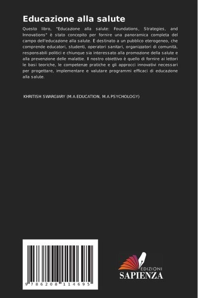 Questo libro, "Educazione alla salute: Foundations, Strategies, and Innovations" è stato concepito per fornire una panoramica completa del campo dell'educazione alla salute. È destinato a un pubblico eterogeneo, che comprende educatori, studenti, operatori sanitari, organizzatori di comunità, responsabili politici e chiunque sia interessato alla promozione della salute e alla prevenzione delle malattie. Il nostro obiettivo è quello di fornire ai lettori le basi teoriche, le competenze pratiche e gli approcci innovativi necessari per progettare, implementare e valutare programmi efficaci di educazione alla salute.