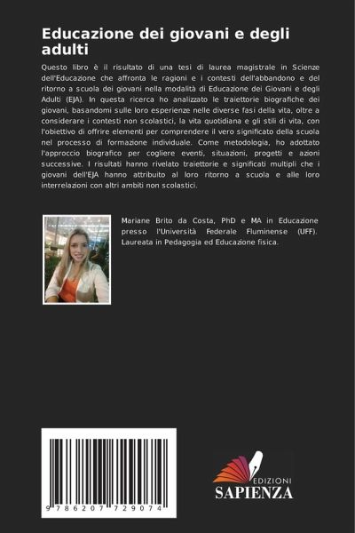 Questo libro è il risultato di una tesi di laurea magistrale in Scienze dell'Educazione che affronta le ragioni e i contesti dell'abbandono e del ritorno a scuola dei giovani nella modalità di Educazione dei Giovani e degli Adulti (EJA). In questa ricerca ho analizzato le traiettorie biografiche dei giovani, basandomi sulle loro esperienze nelle diverse fasi della vita, oltre a considerare i contesti non scolastici, la vita quotidiana e gli stili di vita, con l'obiettivo di offrire elementi per comprendere il vero significato della scuola nel processo di formazione individuale. Come metodologia, ho adottato l'approccio biografico per cogliere eventi, situazioni, progetti e azioni successive. I risultati hanno rivelato traiettorie e significati multipli che i giovani dell'EJA hanno attribuito al loro ritorno a scuola e alle loro interrelazioni con altri ambiti non scolastici.