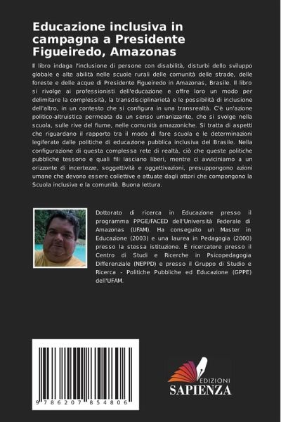 Il libro indaga l'inclusione di persone con disabilità, disturbi dello sviluppo globale e alte abilità nelle scuole rurali delle comunità delle strade, delle foreste e delle acque di Presidente Figueiredo in Amazonas, Brasile. Il libro si rivolge ai professionisti dell'educazione e offre loro un modo per delimitare la complessità, la transdisciplinarietà e le possibilità di inclusione dell'altro, in un contesto che si configura in una transrealtà. C'è un'azione politico-altruistica permeata da un senso umanizzante, che si svolge nella scuola, sulle rive del fiume, nelle comunità amazzoniche. Si tratta di aspetti che riguardano il rapporto tra il modo di fare scuola e le determinazioni legiferate dalle politiche di educazione pubblica inclusiva del Brasile. Nella configurazione di questa complessa rete di realtà, ciò che queste politiche pubbliche tessono e quali fili lasciano liberi, mentre ci avviciniamo a un orizzonte di incertezze, soggettività e oggettivazioni, presuppongono azioni umane che devono essere collettive e attuate dagli attori che compongono la Scuola inclusiva e la comunità. Buona lettura.