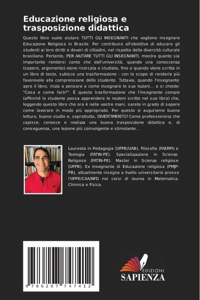 Questo libro vuole aiutare TUTTI GLI INSEGNANTI che vogliono insegnare Educazione Religiosa in Brasile. Per contribuire all'obiettivo di educare gli studenti ai loro diritti e doveri di cittadini, nel rispetto della diversità culturale brasiliana. Pertanto, PER AIUTARE TUTTI GLI INSEGNANTI, mostra quanto sia importante rendersi conto che dall'università, quando una conoscenza (sapere, argomento) viene ricercata e studiata, fino a quando viene scritta in un libro di testo, subisce una trasformazione - con lo scopo di renderla più favorevole alla comprensione dello studente. Tuttavia, quando l'insegnante apre il libro, inizia a pensare a come insegnare le sue lezioni... e si chiede: "Cosa e come farò?". È questa trasformazione che l'insegnante compie (affinché lo studente possa apprendere le nozioni scritte nel suo libro) che, leggendo questo libro che ora è nelle vostre mani, sarete in grado di sapere come lavorare in modo più appropriato. Per questo vi auguriamo buona lettura, buono studio e, soprattutto, DIVERTIMENTO! Come professionista che capisce, conosce e realizza una buona trasposizione didattica e, di conseguenza, una lezione più coinvolgente e stimolante...