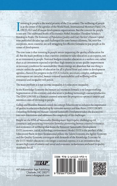 Investing in People is the world priority of the 21st century. The wellbeing of people is at the center of the agendas of the World Bank, International Monetary Fund, UN, OECD, ILO and all major development organizations. But the concern for people is not new. The celebrated books of Economics Nobel Awardees Theodore Schultz's Investing in People. The Economics of Population Quality and Gary Becker's Human Capital were published decades ago and challenged the same human dilemma. Yet, with few exceptions, most countries are still struggling for effective formulas to put people at the center of development. The core issue is that investing in people means improving the quality of education for all. But the main problem is that countries continue to take education as an expense, not as an investment in people. National budgets consider education as a sunken cost, rather than as an investment expected to produce high returns to secure quality improvement as necessary condition for sustainability. Shortcomings are abundant but one thing is certain: unless the quality of education for all is placed front and center in development agendas, chances for progress in the VUCA (volatile, uncertain, complex, ambiguous) environment are curtailed, human centered sustainability and wellbeing will be restrained and inequality will persist. The main problem it is not income inequality, it is education inequality. In the Knowledge Economy the human (as) resources formula is no longer working. Segmentation of the economy and education is probing increasingly counterproductive. The EDUCONOMY is a human centered structure for progress to optimize returns and minimize costs of investing in people. Gallup and Brandon Busteed coined the concept Educonomy to enhance the importance of quality in education backed up by extensive surveys and data bases. Lepeley's EDUCONOMY. Unleashing Wellbeing and Human Centered Sustainable Development takes the discussion into new dimensions and addresses the complexity of the challenges. People are the DNA of Sustainable Development. Says Lepeley challenging old constructs and presenting innovative formulas pioneering human centered economics and economics of wellbeing that frame the Balanced Sustainable Development ESTE (economic, social, technology, environment) Model. ESTE is the product of the Educonomy built on three fundamental pillars: the Talent Economy, the Agility Economy and the Quality Economy convergent with demands of the Knowledge Economy. In the ESTE Model education is no longer a national expense, it is an investment that secures high rates of returns and social and economic inclusiveness anchored in quality standards for all.