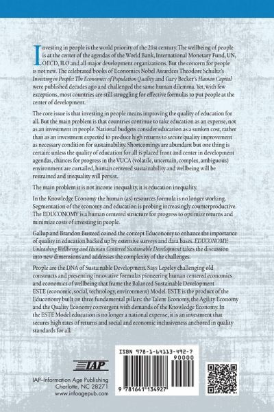 Investing in People is the world priority of the 21st century. The wellbeing of people is at the center of the agendas of the World Bank, International Monetary Fund, UN, OECD, ILO and all major development organizations. But the concern for people is not new. The celebrated books of Economics Nobel Awardees Theodore Schultz's Investing in People. The Economics of Population Quality and Gary Becker's Human Capital were published decades ago and challenged the same human dilemma. Yet, with few exceptions, most countries are still struggling for effective formulas to put people at the center of development. The core issue is that investing in people means improving the quality of education for all. But the main problem is that countries continue to take education as an expense, not as an investment in people. National budgets consider education as a sunken cost, rather than as an investment expected to produce high returns to secure quality improvement as necessary condition for sustainability. Shortcomings are abundant but one thing is certain: unless the quality of education for all is placed front and center in development agendas, chances for progress in the VUCA (volatile, uncertain, complex, ambiguous) environment are curtailed, human centered sustainability and wellbeing will be restrained and inequality will persist. The main problem it is not income inequality, it is education inequality. In the Knowledge Economy the human (as) resources formula is no longer working. Segmentation of the economy and education is probing increasingly counterproductive. The EDUCONOMY is a human centered structure for progress to optimize returns and minimize costs of investing in people. Gallup and Brandon Busteed coined the concept Educonomy to enhance the importance of quality in education backed up by extensive surveys and data bases. Lepeley's EDUCONOMY. Unleashing Wellbeing and Human Centered Sustainable Development takes the discussion into new dimensions and addresses the complexity of the challenges. People are the DNA of Sustainable Development. Says Lepeley challenging old constructs and presenting innovative formulas pioneering human centered economics and economics of wellbeing that frame the Balanced Sustainable Development ESTE (economic, social, technology, environment) Model. ESTE is the product of the Educonomy built on three fundamental pillars: the Talent Economy, the Agility Economy and the Quality Economy convergent with demands of the Knowledge Economy. In the ESTE Model education is no longer a national expense, it is an investment that secures high rates of returns and social and economic inclusiveness anchored in quality standards for all.