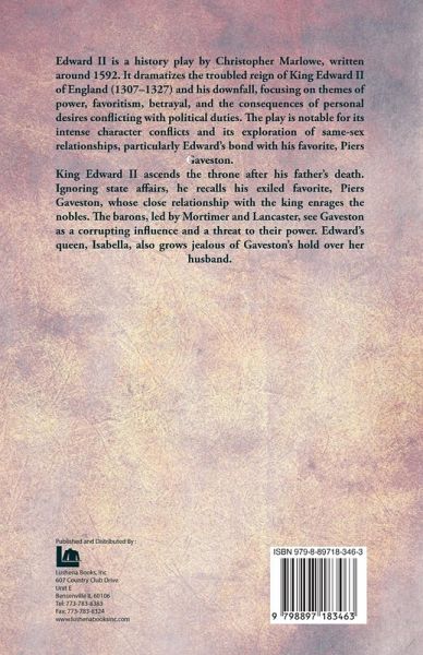 Edward II is a history play by Christopher Marlowe, written around 1592. It dramatizes the troubled reign of King Edward II of England (1307-1327) and his downfall, focusing on themes of power, favoritism, betrayal, and the consequences of personal desires conflicting with political duties. The play is notable for its intense character conflicts and its exploration of same-sex relationships, particularly Edward's bond with his favorite, Piers Gaveston. King Edward II ascends the throne after his father's death. Ignoring state affairs, he recalls his exiled favorite, Piers Gaveston, whose close relationship with the king enrages the nobles. The barons, led by Mortimer and Lancaster, see Gaveston as a corrupting influence and a threat to their power. Edward's queen, Isabella, also grows jealous of Gaveston's hold over her husband. Tensions rise as the barons force Edward to exile Gaveston again. Isabella, initially loyal to Edward, tries to mediate between him and the nobles, but Edward's obsession with Gaveston leads to a deeper rift. Eventually, Gaveston is captured and executed by the nobles. Devastated by Gaveston's death, Edward seeks vengeance, leading to civil war. He finds a new favorite, Spencer, but his reckless rule weakens his position. Meanwhile, Isabella, rejected by Edward, allies with Mortimer, her lover, and travels to France, gathering an army to overthrow her husband. Isabella and Mortimer's forces invade England, capture Edward, and force him to abdicate in favor of his young son, Edward III. The fallen king is imprisoned, while Mortimer and Isabella take control of the kingdom. Edward is brutally murdered in prison (historically rumored to be killed with a red-hot poker, symbolizing humiliation). However, Isabella and Mortimer's triumph is short-lived-Edward III, now of age, avenges his father by executing Mortimer and imprisoning his mother. Unlike Marlowe's earlier protagonists (Tamburlaine, Doctor Faustus), Edward II is not a powerful hero but a weak, emotionally driven king. His love for Gaveston is sincere but politically disastrous. His downfall is tragic, as he loses everything-his crown, his dignity, and ultimately, his life. While based on historical events, Marlowe takes dramatic liberties, especially in portraying Edward's sexuality more explicitly than historical records suggest. The play was groundbreaking for its time, offering a nuanced depiction of same-sex love and political intrigue.