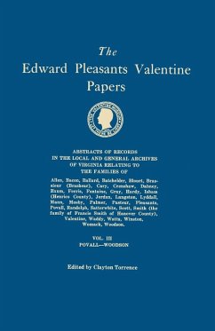 These abstracts embody virtually every shred of evidence available in the local and general archives of Virginia pertaining to the families Abstracts of 17th- and 18th-Century Virginia Records Relating to the Families of Allen, Bacon, Ballard, Batchelder, Blouet, Brassieur, (Brashear), Cary, Crenshaw, Dabney, Exum, Ferris, Fontaine, Gray, Hardy, Isham, Jordan, Langston, Lyddall, Mann, Mosby, Palmer, Pasteur, Pleasants, Povall, Randolph, Satterwhite, Scott, Smith, Valentine, Waddy, Watts, Winston, Womack, and Woodson. There are, for example, abstracts founded on land and probate records,…mehr