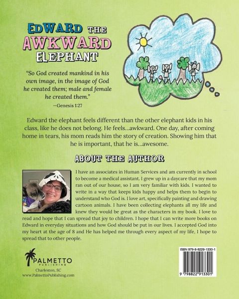 I have an associates in Human Services and am currently in school to become a medical assistant. I grew up in a daycare that my mom ran out of our house, so I am very familiar with kids. I wanted to write in a way that keeps kids happy and helps them to begin to understand who God is. I love art, specifically painting and drawing cartoon animals. I have been collecting elephants all my life and knew they would be great as the characters in my book. I love to read and hope that I can spread that joy to children. I hope that I can write more books on Edward in everyday situations and how God should be put in our lives. I accepted God into my heart at the age of 8 and He has helped me through every aspect of my life, I hope to spread that to other people.