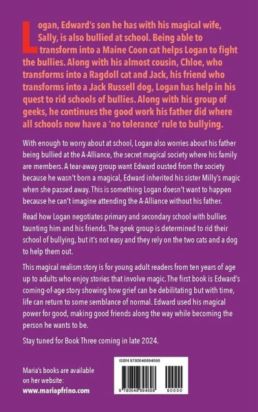 Logan, Edward's son he has with his magical wife, Sally, is also bullied at school. Being able to transform into a Maine Coon cat helps Logan to fight the bullies. Along with his almost cousin, Chloe, who transforms into a Ragdoll cat and Jack, his friend who transforms into a Jack Russell dog, Logan has help in his quest to rid schools of bullies. Along with his group of geeks, he continues the good work his father did where all schools now have a 'no tolerance' rule to bullying. With enough to worry about at school, Logan also worries about his father being bullied at the A-Alliance, the secret magical society where his family are members. A tear-away group wants Edward ousted from the society because he wasn't born a magical, Edward inherited his sister Milly's magic when she passed away. This is something Logan doesn't want to happen because he can't imagine attending the A-Alliance without his father. Read how Logan negotiates primary and secondary school with bullies taunting him and his friends. The geek group is determined to rid their school of bullying, but it's not easy and they rely on the two cats and a dog to help them out. This magical realism story is for young adult readers from ten years of age up to adults who enjoy stories that involve magic. The first book is Edward's coming-of-age story showing how grief can be debilitating but with time, life can return to some semblance of normal. Edward used his magical power for good, making good friends along the way while becoming the person he wants to be. Stay tuned for Book Three coming in late 2024.