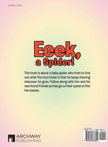 Everywhere the baby spider goes, he always hears a very strange noise: "Eeek!" He hears it when he goes into a room, when he rides in a car, when he jumps up and down the stairs, and even when he's playing at the park! It scares him so much that he always runs away and hides until it sounds safe again. What could that strange noise mean? He asks his friends, the grasshopper, the ladybug, and the roly-poly, if they've ever heard that noise, but they never have. Together the four little friends try to figure out exactly what "Eeek" means so that the baby spider will know why the sound follows him everywhere. In this children's story, four young insect friends set out to find out why one strange and loud noise always happens when the baby spider is around.