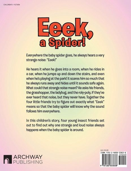 Everywhere the baby spider goes, he always hears a very strange noise: "Eeek!" He hears it when he goes into a room, when he rides in a car, when he jumps up and down the stairs, and even when he's playing at the park! It scares him so much that he always runs away and hides until it sounds safe again. What could that strange noise mean? He asks his friends, the grasshopper, the ladybug, and the roly-poly, if they've ever heard that noise, but they never have. Together the four little friends try to figure out exactly what "Eeek" means so that the baby spider will know why the sound follows him everywhere. In this children's story, four young insect friends set out to find out why one strange and loud noise always happens when the baby spider is around.
