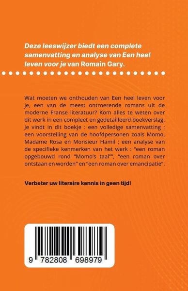 Wat moeten we onthouden van Een heel leven voor je, een van de meest ontroerende romans uit de moderne Franse literatuur? Kom alles te weten over dit werk in een compleet en gedetailleerd boekverslag. U vindt in dit boekje : - Een volledige samenvatting - Een voorstelling van de hoofdpersonen zoals Momo, Madame Rosa en Monsieur Hamil - Een analyse van de specifieke kenmerken van het werk: een roman opgebouwd rond "Momo's taal", een roman over ontstaan en worden, en een roman over emancipatie Een referentieanalyse om snel de betekenis van het werk te begrijpen.