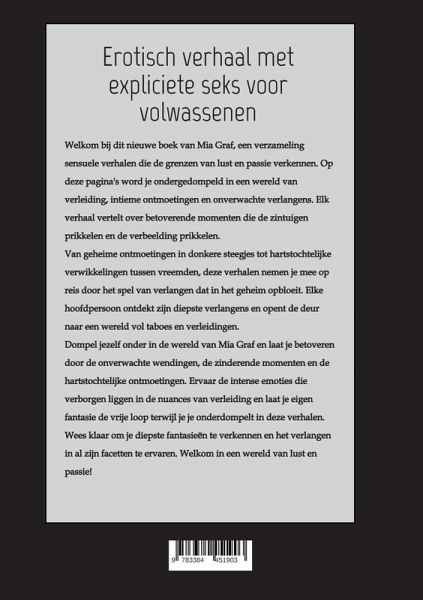 Welkom bij dit nieuwe boek van Mia Graf, een verzameling sensuele verhalen die de grenzen van lust en passie verkennen. Op deze pagina's word je ondergedompeld in een wereld van verleiding, intieme ontmoetingen en onverwachte verlangens. Elk verhaal vertelt over betoverende momenten die de zintuigen prikkelen en de verbeelding prikkelen. Van geheime ontmoetingen in donkere steegjes tot hartstochtelijke verwikkelingen tussen vreemden, deze verhalen nemen je mee op reis door het spel van verlangen dat in het geheim opbloeit. Elke hoofdpersoon ontdekt zijn diepste verlangens en opent de deur naar een wereld vol taboes en verleidingen. Het boek bevat expliciete seksuele inhoud en is niet geschikt voor jongeren onder de 18 jaar. De verhalen zijn pure fantasie: de personages zijn allemaal meerderjarig en, net als de inhoud, fictief. Dompel je onder in de wereld van Mia Graf en laat je betoveren door de onverwachte wendingen, de zinderende momenten en de hartstochtelijke ontmoetingen. Ervaar de intense emoties die verborgen liggen in de nuances van verleiding en laat je eigen fantasie de vrije loop terwijl je je onderdompelt in deze verhalen. Wees klaar om je diepste fantasieën te verkennen en het verlangen in al zijn facetten te ervaren. Welkom in een wereld van lust en passie!