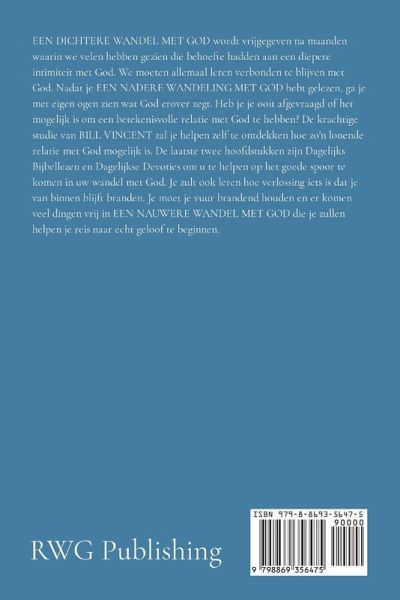 EEN DICHTERE WANDEL MET GOD wordt vrijgegeven na maanden waarin we velen hebben gezien die behoefte hadden aan een diepere intimiteit met God. We moeten allemaal leren verbonden te blijven met God. Nadat je EEN NADERE WANDELING MET GOD hebt gelezen, ga je met eigen ogen zien wat God erover zegt. Heb je je ooit afgevraagd of het mogelijk is om een ¿¿betekenisvolle relatie met God te hebben? De krachtige studie van BILL VINCENT zal je helpen zelf te ontdekken hoe zo'n lonende relatie met God mogelijk is. De laatste twee hoofdstukken zijn Dagelijks Bijbellezen en Dagelijkse Devoties om u te helpen op het goede spoor te komen in uw wandel met God. Je zult ook leren hoe verlossing iets is dat je van binnen blijft branden. Je moet je vuur brandend houden en er komen veel dingen vrij in EEN NAUWERE WANDEL MET GOD die je zullen helpen je reis naar echt geloof te beginnen.