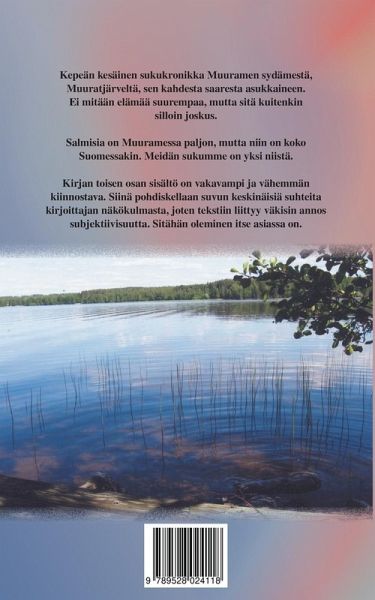 Kepeän kesäinen sukukronikka Muuramen sydämestä, Muuratjärveltä, sen kahdesta saaresta asukkaineen. Ei mitään elämää suurempaa, mutta sitä kuitenkin silloin joskus. Salmisia on Muuramessa paljon, mutta niin on koko Suomessakin. Meidän sukumme on yksi niistä. Kirjan toisen osan sisältö on vakavampi ja vähemmän kiinnostava. Siinä pohdiskellaan suvun keskinäisiä suhteita kirjoittajan näkökulmasta, joten tekstiin liittyy väkisin annos subjektiivisuutta. Sitähän oleminen itse asiassa on.