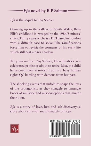A mother of three, R P Salmon grew up in a Lancashire mill town where her grandmother was a cotton weaver. She has had careers in social work, teaching and academia and draws on them all in her writing. Renowned for ground-breaking academic publications, she writes fiction under the pseudonym R P Salmon, tackling gritty issues and intricate human relationships. Efa is the sequel to her debut novel Toy Soldier. She is a keen exponent of the power of story to reach different people in different ways and stay with them for different reasons.