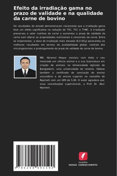 Os resultados do estudo demonstraram claramente que a irradiação gama teve um efeito significativo na redução de TVC, TCC e TYMC. A irradiação preservou o valor nutritivo da carne e aumentou o prazo de validade da carne sem alterar as propriedades nutricionais e sensoriais da carne. Entre os tratamentos, a dose de irradiação mais elevada (6,0 KGy) apresentou os melhores resultados em termos de aceitabilidade global, controlo dos microrganismos e prolongamento do prazo de validade da carne de bovino.