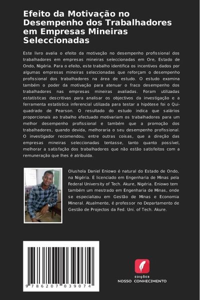 Este livro avalia o efeito da motivação no desempenho profissional dos trabalhadores em empresas mineiras seleccionadas em Ore, Estado de Ondo, Nigéria. Para o efeito, este trabalho identifica os incentivos dados por algumas empresas mineiras seleccionadas que reforçam o desempenho profissional dos trabalhadores na área de estudo. O estudo examina também o poder da motivação para atenuar o fraco desempenho dos trabalhadores nas empresas mineiras avaliadas. Foram utilizadas estatísticas descritivas para analisar os objectivos da investigação e a ferramenta estatística inferencial utilizada para testar a hipótese foi o Qui-quadrado de Pearson. O resultado do estudo indica que salários proporcionais ao trabalho efectuado motivariam os trabalhadores para um melhor desempenho profissional e também que a promoção dos trabalhadores, quando devida, melhoraria o seu desempenho profissional. O investigador recomendou, entre outras coisas, que a direção das empresas mineiras seleccionadas tentasse, tanto quanto possível, melhorar a satisfação dos trabalhadores que não estão satisfeitos com a remuneração que lhes é atribuída.