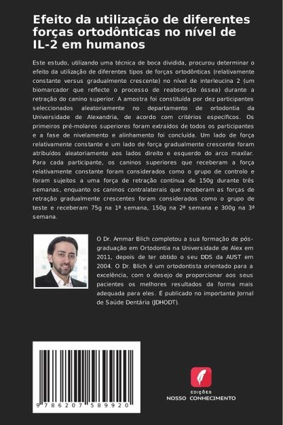 Este estudo, utilizando uma técnica de boca dividida, procurou determinar o efeito da utilização de diferentes tipos de forças ortodônticas (relativamente constante versus gradualmente crescente) no nível de interleucina 2 (um biomarcador que reflecte o processo de reabsorção óssea) durante a retração do canino superior. A amostra foi constituída por dez participantes seleccionados aleatoriamente no departamento de ortodontia da Universidade de Alexandria, de acordo com critérios específicos. Os primeiros pré-molares superiores foram extraídos de todos os participantes e a fase de nivelamento e alinhamento foi concluída. Um lado de força relativamente constante e um lado de força gradualmente crescente foram atribuídos aleatoriamente aos lados direito e esquerdo do arco maxilar. Para cada participante, os caninos superiores que receberam a força relativamente constante foram considerados como o grupo de controlo e foram sujeitos a uma força de retração contínua de 150g durante três semanas, enquanto os caninos contralaterais que receberam as forças de retração gradualmente crescentes foram considerados como o grupo de teste e receberam 75g na 1ª semana, 150g na 2ª semana e 300g na 3ª semana.