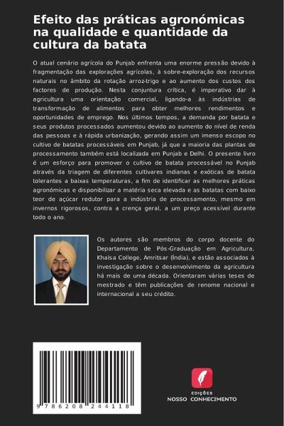 O atual cenário agrícola do Punjab enfrenta uma enorme pressão devido à fragmentação das explorações agrícolas, à sobre-exploração dos recursos naturais no âmbito da rotação arroz-trigo e ao aumento dos custos dos factores de produção. Nesta conjuntura crítica, é imperativo dar à agricultura uma orientação comercial, ligando-a às indústrias de transformação de alimentos para obter melhores rendimentos e oportunidades de emprego. Nos últimos tempos, a demanda por batata e seus produtos processados aumentou devido ao aumento do nível de renda das pessoas e à rápida urbanização, gerando assim um imenso escopo no cultivo de batatas processáveis em Punjab, já que a maioria das plantas de processamento também está localizada em Punjab e Delhi. O presente livro é um esforço para promover o cultivo de batata processável no Punjab através da triagem de diferentes cultivares indianas e exóticas de batata tolerantes a baixas temperaturas, a fim de identificar as melhores práticas agronómicas e disponibilizar a matéria seca elevada e as batatas com baixo teor de açúcar redutor para a indústria de processamento, mesmo em invernos rigorosos, contra a crença geral, a um preço acessível durante todo o ano.