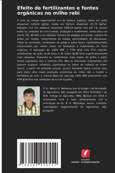 O solo do campo experimental era de textura argilosa, baixo em azoto disponível (169,43 kg/ha), médio em fósforo disponível (31,73 kg/ha), bastante rico em potássio disponível (359,53 kg/ha) com pH 7,8. Quase todos os atributos de crescimento, produção e rendimento, como altura da planta (30, 60 DAS e na colheita), número de espigas por planta, número de grãos por espiga, comprimento da espiga, percentagem de descasque, índice de sementes, rendimento de grãos e palha foram significativamente influenciados por vários níveis de fertilizante e tratamentos de fonte orgânica. A aplicação de 100% RDF + FYM @10 t/ha (T2) registou rendimentos de grão (4,18 t/ha) e de palha (8,99 t/ha) significativamente mais elevados. Enquanto os rendimentos mais baixos de grãos e palha foram registados com o controlo (T6). Mas os diferentes tratamentos não tiveram qualquer influência significativa no índice de colheita do milho. Assim, a partir do presente estudo, parece bastante lógico concluir que, para obter uma maior produção económica de milho rabi e manter a fertilidade do solo, a cultura deve ser aplicada 100% RDF juntamente com FYM @10 t/ha nas condições do sul de Gujarat.