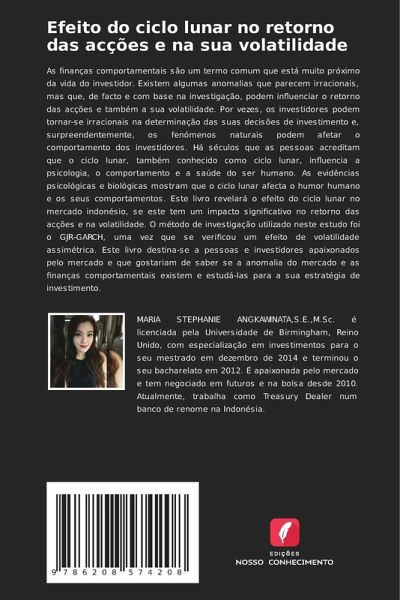 As finanças comportamentais são um termo comum que está muito próximo da vida do investidor. Existem algumas anomalias que parecem irracionais, mas que, de facto e com base na investigação, podem influenciar o retorno das acções e também a sua volatilidade. Por vezes, os investidores podem tornar-se irracionais na determinação das suas decisões de investimento e, surpreendentemente, os fenómenos naturais podem afetar o comportamento dos investidores. Há séculos que as pessoas acreditam que o ciclo lunar, também conhecido como ciclo lunar, influencia a psicologia, o comportamento e a saúde do ser humano. As evidências psicológicas e biológicas mostram que o ciclo lunar afecta o humor humano e os seus comportamentos. Este livro revelará o efeito do ciclo lunar no mercado indonésio, se este tem um impacto significativo no retorno das acções e na volatilidade. O método de investigação utilizado neste estudo foi o GJR-GARCH, uma vez que se verificou um efeito de volatilidade assimétrica. Este livro destina-se a pessoas e investidores apaixonados pelo mercado e que gostariam de saber se a anomalia do mercado e as finanças comportamentais existem e estudá-las para a sua estratégia de investimento.