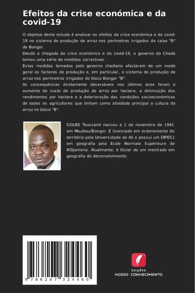 O objetivo deste estudo é analisar os efeitos da crise económica e da covid-19 no sistema de produção de arroz nos perímetros irrigados da caixa "B" de Bongor.Desde a chegada da crise económica e da covid-19, o governo do Chade tomou uma série de medidas correctivas.Estas medidas tomadas pelo governo chadiano afectaram de um modo geral os factores de produção e, em particular, o sistema de produção de arroz nos perímetros irrigados do bloco Bongor "B".As consequências diretamente observáveis nos últimos anos foram o aumento do custo de produção do arroz por hectare, a diminuição dos rendimentos por hectare e a deterioração das condições socioeconómicas de todos os agricultores que tinham como atividade principal a cultura do arroz no bloco "B".