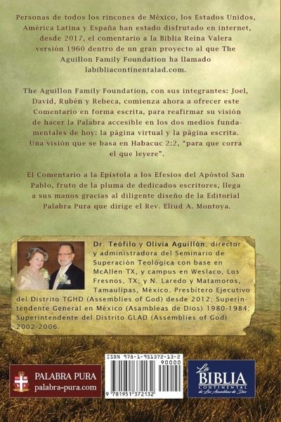 The Aguillon Family Foundation trae al público en general su primer libro impreso dentro del comentario a la Biblia version Reina Valera 1960, luego de varios años de ser leído gratuitamente en la internet a través de la página http: //labibliacontinentalad.com/ La página ha adquirido una popularidad sobresaliente y recibe decenas de miles de visitas diariamente. Este primer libro -el cual inicia con el comentario del libro de Efesios- fue redactado por destacados académicos seleccionados de todos los rincones del mundo de habla hispana, y trae al lector una lectura fresca y vibrante que explica el significado de todos y cada uno de los pasajes de esta epístola desde un punto de vista pentecostal. Este comentario impreso (y digital), a diferencia del que puede leerse en http: //labibliacontinentalad.com/, contiene un formato bastante amigable y preguntas y exámenes que le hacen apto para ser utilizado como libro de texto en institutos bíblicos y seminarios. Algunas preguntas incluidas en el capítulo 1 son, por ejemplo: PREGUNTAS DEDUCTIVAS 1. ¿Cuáles fueron las credenciales de Pablo que le daban autoridad para escribir a los efesios? 2. ¿Por qué Pablo se refiere a los efesios como santos y fieles aun cuando algunos de ellos pudieren tener problemas morales? 3. Sabiendo que Dios nos ha bendecido con distintos tipos de bendiciones, ¿cuáles son las bendiciones a las que Pablo se refiere y por qué les da a éstas carácter de preeminencia? 4. Explique el concepto nos escogió en él antes de la fundación del mundo. 5. ¿Qué tiene que ver la expresión habiéndonos predestinado con el plan salvífico de Dios? 6. Explique el término adopción (usado por Pablo en Efesios 1). 7. Señale los objetivos de Dios al redimir al hombre mencionados en Efesios capítulo 1. 8. ¿Cuál es el significado de la palabra redención? 9. ¿Qué significa la palabra arras en el versículo 14? PREGUNTAS INDUCTIVAS 1. ¿Por qué es importante que un siervo de Dios tenga seguridad de su llamamiento divino? 2. ¿A qué se refiere Pablo con la expresión: En los lugares celestiales en Cristo? 3. ¿Es la santificación el objetivo de Dios al salvar al hombre o es su consecuencia? ¿o ambos? ¿Por qué? 4. ¿Por qué la obra expiatoria de Cristo es suficiente para salvar al pecador? 5. ¿Qué implica el término reunir todas las cosas en Cristo? 6. ¿Dónde termina la voluntad anticipada de Dios para la salvación y dónde comienza la responsabilidad humana? 7. ¿Cuál es la importancia de cada uno de los elementos de la oración de Pablo contenida en Efesios 1? ¿Por qué estos elementos son esenciales para la vida cristiana? TRABAJOS OPTATIVOS 1. Haga un estudio más o menos exhaustivo de todas las bendiciones prometidas por Cristo a sus discípulos. 2. Haga un análisis del tema de la santidad basado en el capítulo 1 de Efesios. 3. Examinando algunos versículos claves a través de las Escrituras, haga una monografía del papel individual que juega cada una de las personas de la Divinidad en el plan de salvación del hombre. 4. Escudriñe el Nuevo Testamento para encontrar todos los reclamos de Cristo como cabeza de la iglesia, enumere las áreas implicadas y aplique esto a la vida diaria de cada creyente. El comentario añade notas doctrinales, históricas y controversiales, al tiempo de seleccionar algunos pasajes que sirven la para meditación individual. Este comentario es producto del esfuerzo de una multitud de personas con capacidades sobresalientes en su área.