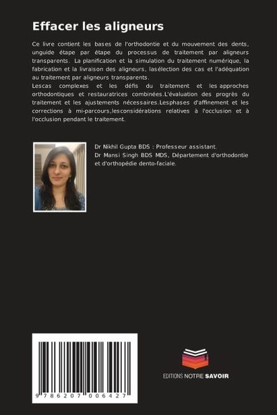 Ce livre contient les bases de l'orthodontie et du mouvement des dents, unguide étape par étape du processus de traitement par aligneurs transparents. La planification et la simulation du traitement numérique, la fabrication et la livraison des aligneurs, lasélection des cas et l'adéquation au traitement par aligneurs transparents.Lescas complexes et les défis du traitement et les approches orthodontiques et restauratrices combinées.L'évaluation des progrès du traitement et les ajustements nécessaires.Lesphases d'affinement et les corrections à mi-parcours,lesconsidérations relatives à l'occlusion et à l'occlusion pendant le traitement.