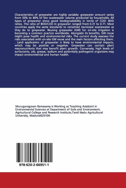 Characteristics of greywater are highly variable; greywater amount varies from 50% to 80% of the wastewater volume produced by households. All types of greywater show good biodegradability in terms of COD: BOD ratios. The ratio of BOD/COD in greywater ranged from 0.31 to 0.71. Most countries apply the same standards to reclaimed municipal wastewater as they do to greywater. Reusing greywater (GW) for on-site irrigation is becoming a common practice worldwide. Alongside its benefits, GW reuse might pose health and environmental risks. The current study assesses the risks associated with on-site GW reuse and the main factors affecting them. . Land application of greywater is likely to have environmental impacts, which may be positive or negative. Greywater can contain plant macronutrients that may benefit plant growth. Conversely, high levels of surfactants, oils, grease, sodium and potentially pathogenic organisms may impact environmental and human health.