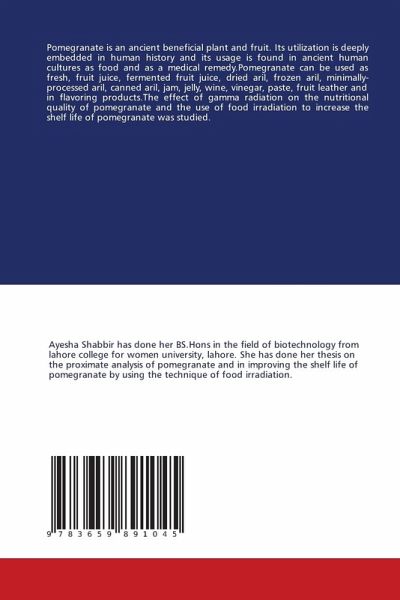 Pomegranate is an ancient beneficial plant and fruit. Its utilization is deeply embedded in human history and its usage is found in ancient human cultures as food and as a medical remedy.Pomegranate can be used as fresh, fruit juice, fermented fruit juice, dried aril, frozen aril, minimally-processed aril, canned aril, jam, jelly, wine, vinegar, paste, fruit leather and in flavoring products.The effect of gamma radiation on the nutritional quality of pomegranate and the use of food irradiation to increase the shelf life of pomegranate was studied.