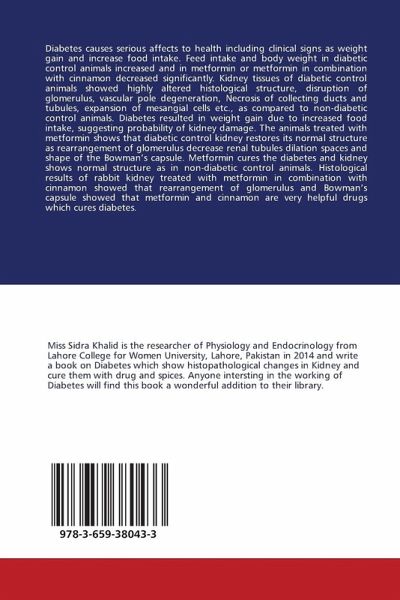 Diabetes causes serious affects to health including clinical signs as weight gain and increase food intake. Feed intake and body weight in diabetic control animals increased and in metformin or metformin in combination with cinnamon decreased significantly. Kidney tissues of diabetic control animals showed highly altered histological structure, disruption of glomerulus, vascular pole degeneration, Necrosis of collecting ducts and tubules, expansion of mesangial cells etc., as compared to non-diabetic control animals. Diabetes resulted in weight gain due to increased food intake, suggesting probability of kidney damage. The animals treated with metformin shows that diabetic control kidney restores its normal structure as rearrangement of glomerulus decrease renal tubules dilation spaces and shape of the Bowman's capsule. Metformin cures the diabetes and kidney shows normal structure as in non-diabetic control animals. Histological results of rabbit kidney treated with metformin incombination with cinnamon showed that rearrangement of glomerulus and Bowman's capsule showed that metformin and cinnamon are very helpful drugs which cures diabetes.