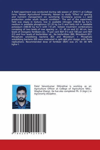 A field experiment was conducted during rabi season of 2010-11 at College Farm, Navsari Agricultural University, Navsari to study "Effect of spacing and nutrient management on sunnhemp (Crotalaria juncea L.) seed production under south Gujarat condition". The soil of the experiment field was clayey in texture, low in available nitrogen (186.00 kg ha-1), medium in available phosphorus (31.20 kg ha-1) and fairly rich in available potassium (348.00 kg ha-1) with 7.8 pH. Sixteen treatment combinations consisting of two levels of row spacing i.e., S1: 45 cm and S2: 60 cm, two levels of inorganic fertilizers viz., 75 per cent RDF (F1) and 100 per cent RDF (F2) and four levels of biofertilizer viz., No biofertilizer (B0), Rhizobium (B1), Phosphate solubilizing bacteria (B2) and Rhizobium + Phosphate solubilizing bacteria (B3) were evaluated in split-split plot design with three replications. Recommended dose of fertilizer (RDF) was 25: 50: 00 NPK kgha-1.