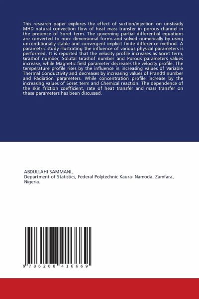This research paper explores the effect of suction/injection on unsteady MHD natural convection flow of heat mass transfer in porous channel in the presence of Soret term. The governing partial differential equations are converted to non- dimensional forms and solved numerically by using unconditionally stable and convergent implicit finite difference method. A parametric study illustrating the influence of various physical parameters is performed. It is reported that the velocity profile increases as Soret term, Grashof number, Solutal Grashof number and Porous parameters values increase, while Magnetic field parameter decreases the velocity profile. The temperature profile rises by the influence in increasing values of Variable Thermal Conductivity and decreases by increasing values of Prandtl number and Radiation parameters. While concentration profile increase by the increasing values of Soret term and Chemical reaction. The dependence of the skin friction coefficient, rate of heat transfer and mass transfer on these parameters has been discussed.